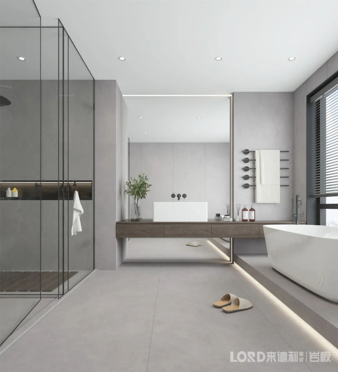 过往在卫浴间风格上,我们习惯用花砖、六角砖进行混搭,这样容易产生杂乱烦躁的情绪,且卫浴间本存在设计局限性;这时我们可选用800x2600mm规格星河岩板,以一板到顶的直观视效,打造一个连邻居都羡慕的卫浴间范本。