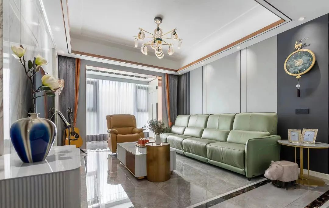 浅色地面携黑金花加工点缀,与窗外光源相呼应,更显通透与大气;而牛油果绿本身就是很清新的色调,让人走进去便有眼前一亮的感觉。
