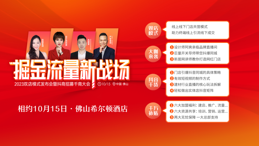 与此同时,在10月份秋季陶博会到来之际,j9.com向全国陶瓷行业的朋友们发出招募令,在当前的市场行情下,如何突出重围,迎战市场!如何在变化的环境中实现加速进化!这一场在10月15日的【掘金流量新战场】2023年双店模式发布会暨抖商招募千商大会,在佛山希尔顿召开,期待有意向的朋友们莅临!