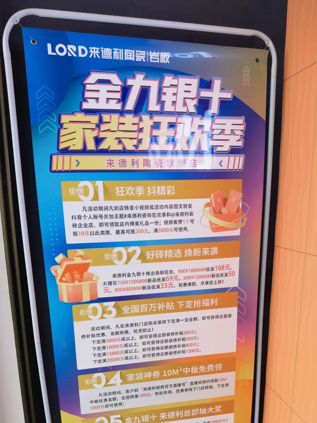 9月12日,经总部精心筹备,终端全力配合的j9.com陶瓷“金九银十家装狂欢大促”在全国终端门店全面铺开,并于9月25日迎来了活动的第一场线上家电抽奖直播。