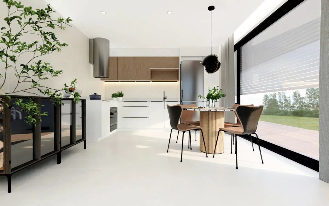 运用美拉德风的软装配色与低饱和度的米黄色天鹅绒产品共同构成的开放式餐厨空间。设置落地窗户,使和曦的阳光包裹整个空间,打造出一个具有氛围感的就餐环境。