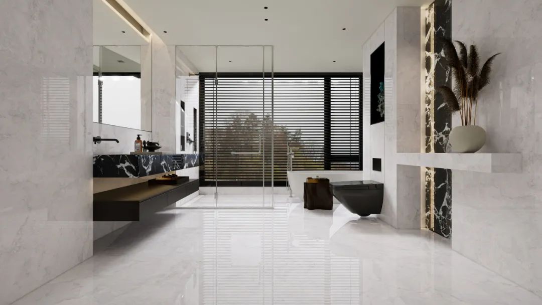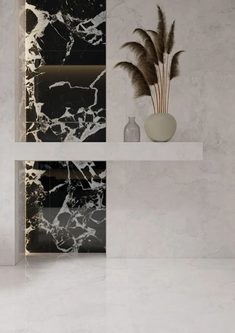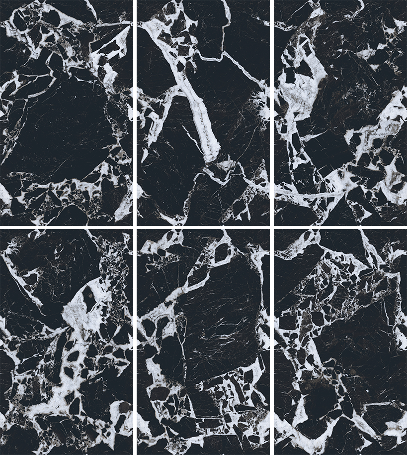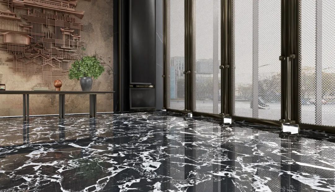 以深邃神秘的黑色为基调,宛如夜的使者,将无尽深邃融入空间。白色纹理肆意纵横,似宇宙流星划过夜幕,打破沉闷,赋予独特视觉冲击。其纹理自然流畅且富有变化,每一片瓷砖都是独一无二的艺术之作。