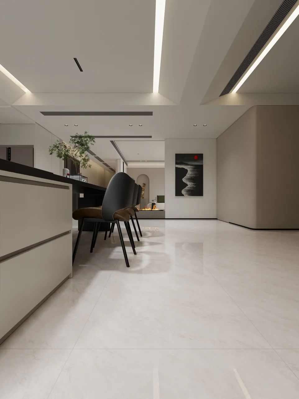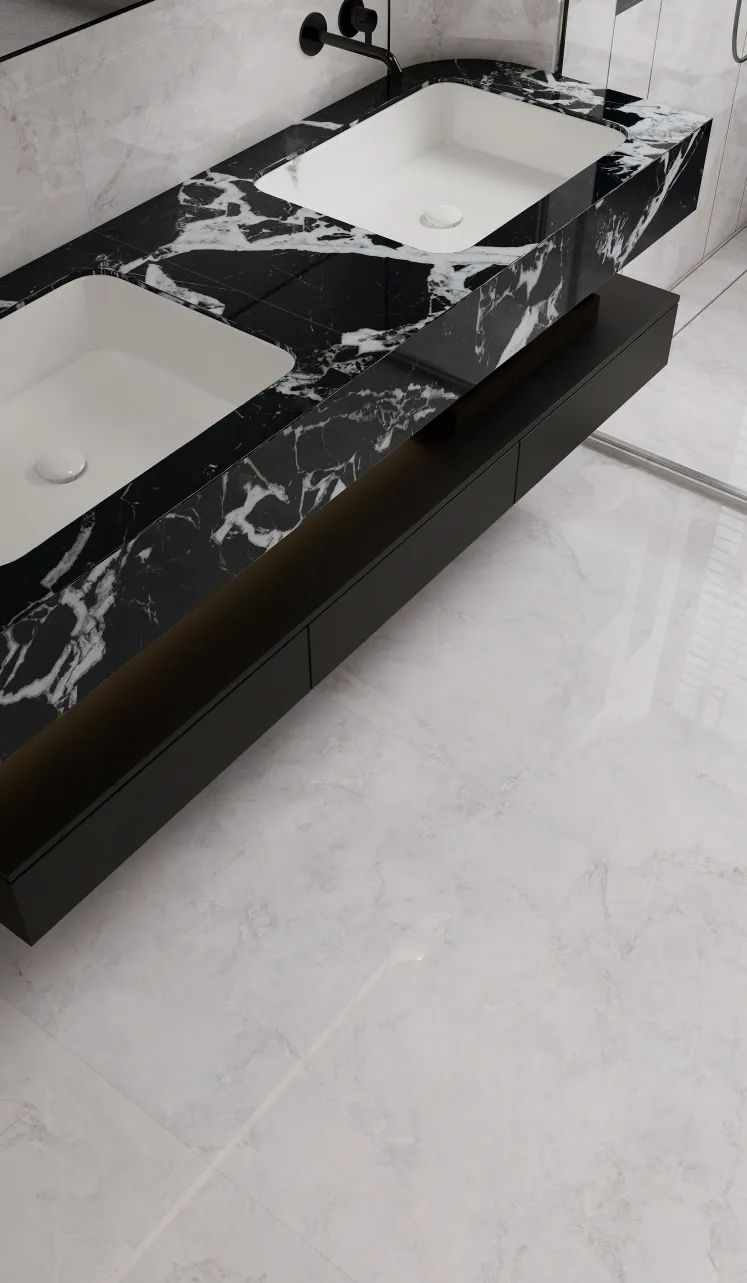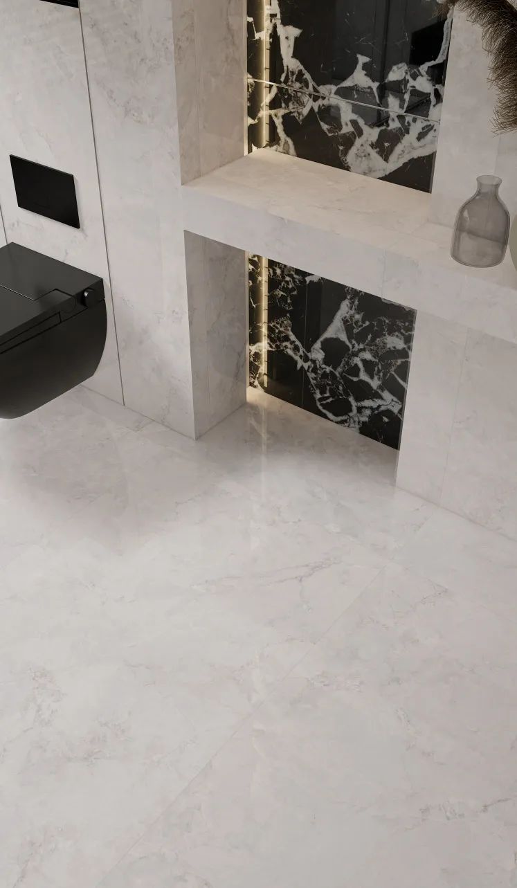 以深邃神秘的黑色为基调,宛如夜的使者,将无尽深邃融入空间。白色纹理肆意纵横,似宇宙流星划过夜幕,打破沉闷,赋予独特视觉冲击。其纹理自然流畅且富有变化,每一片瓷砖都是独一无二的艺术之作。