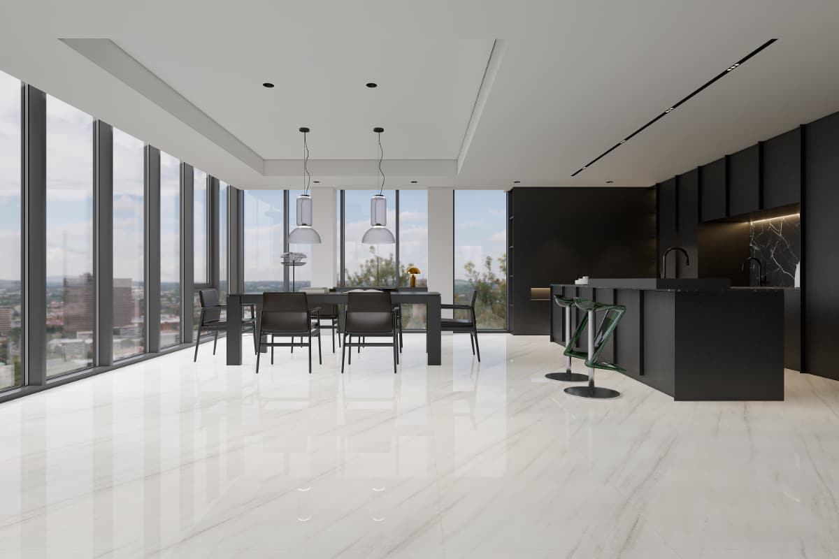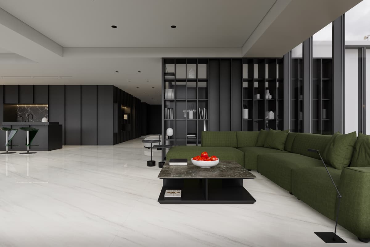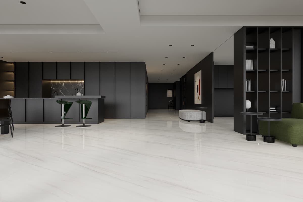 模拟天然砂岩沉积纹理,白色基底上流淌的浅棕细脉如被阳光浸润的沙痕。釉面赋予细腻金沙质感,晶体闪光与柔光肌理交织,为现代简约或轻奢空间营造纯净素雅又不失自然流动感的氛围。