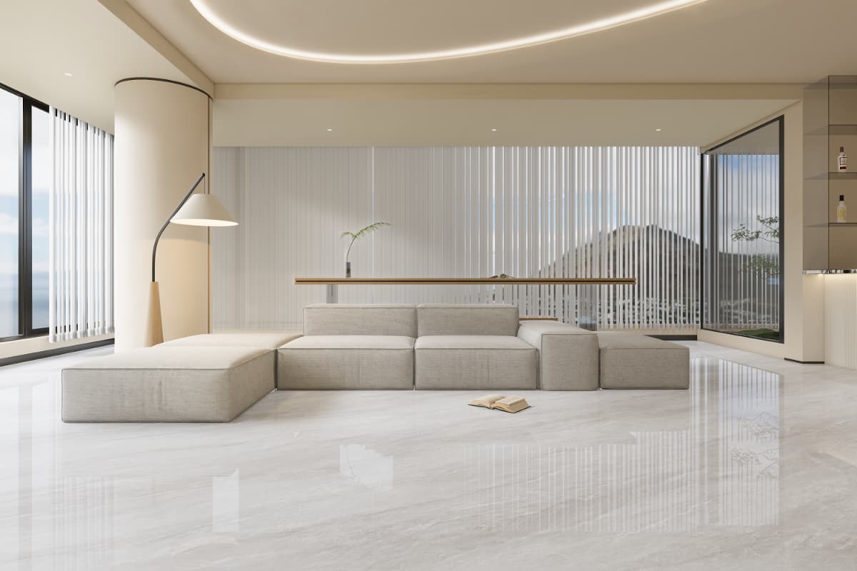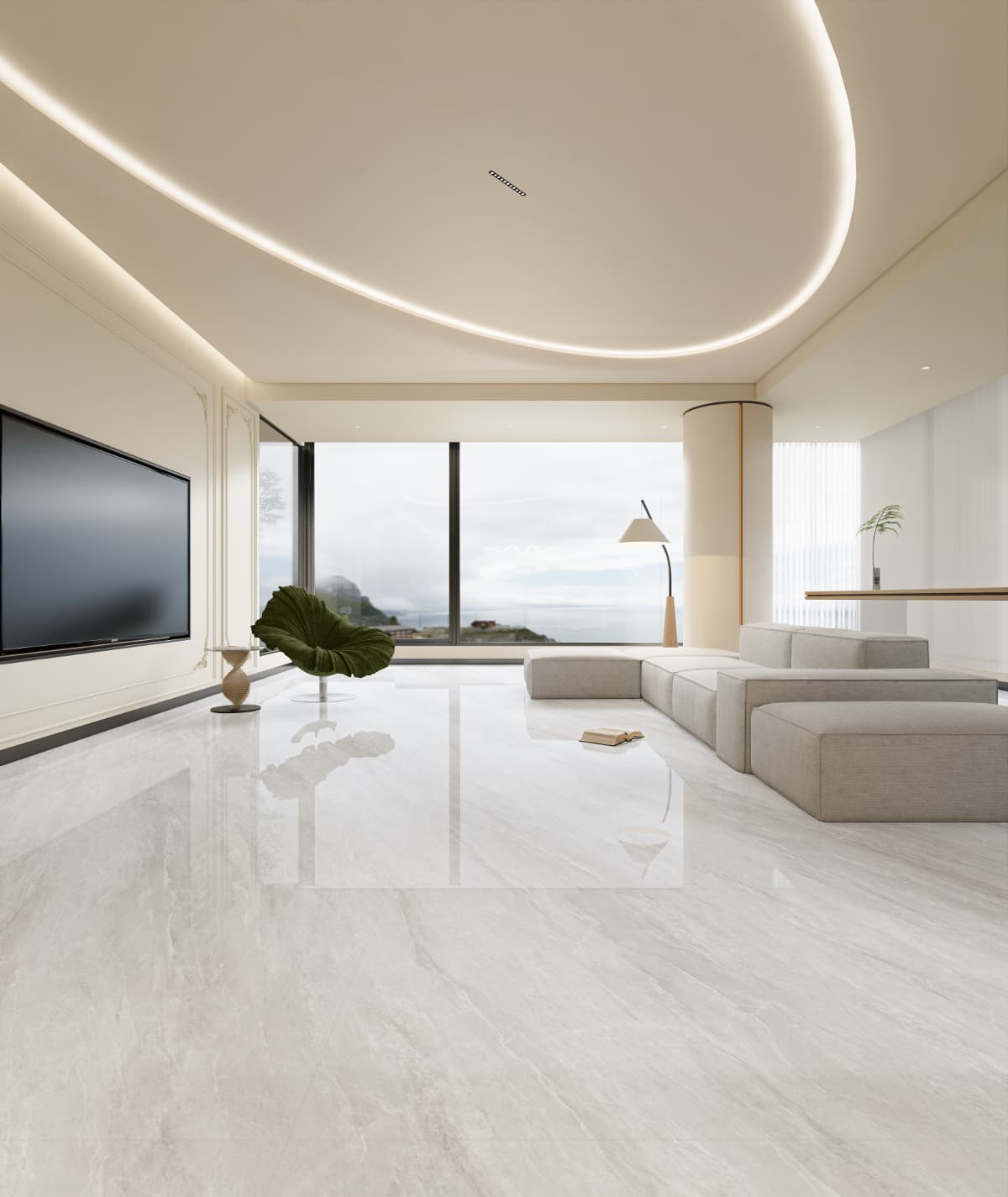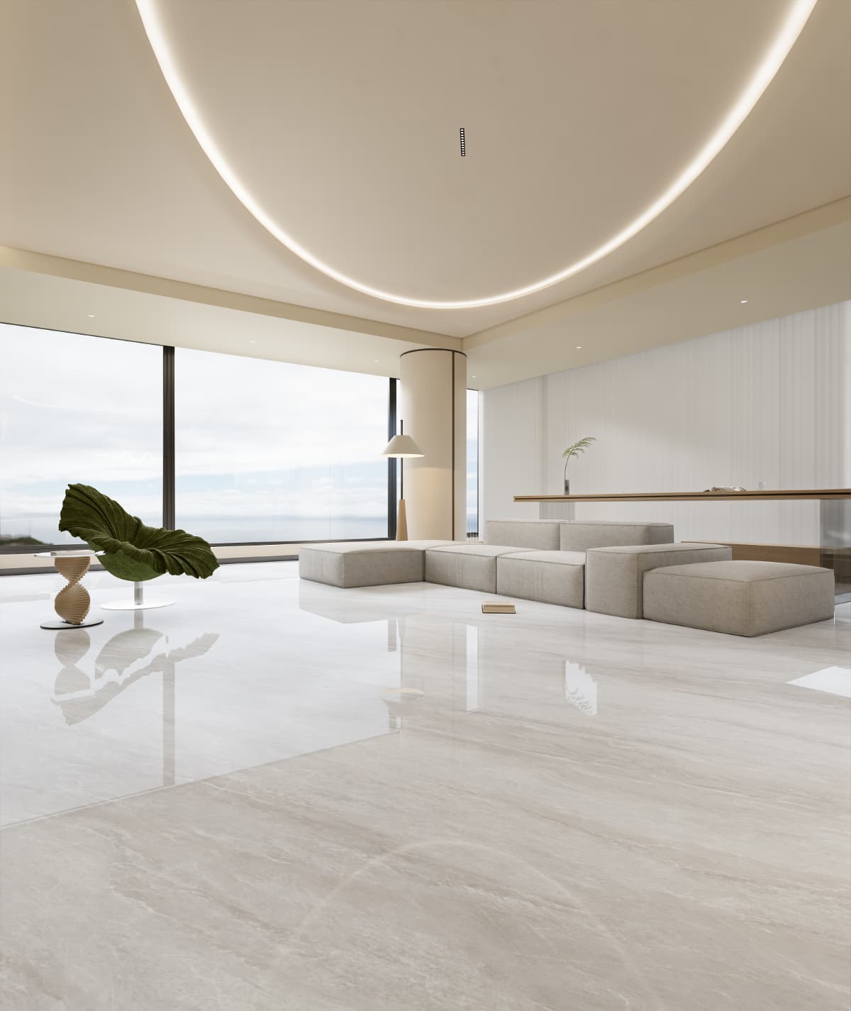 灵感源自天然砂石风化纹理,灰白基底上交织的流线纹路模拟星河轨迹。釉面融入结晶颗粒,在光线折射下呈现星砂闪烁效果,为现代极简或轻奢空间增添低调的星空韵律感。