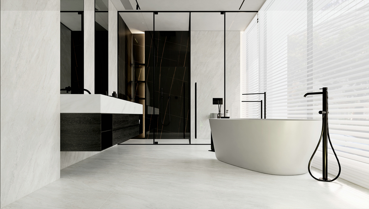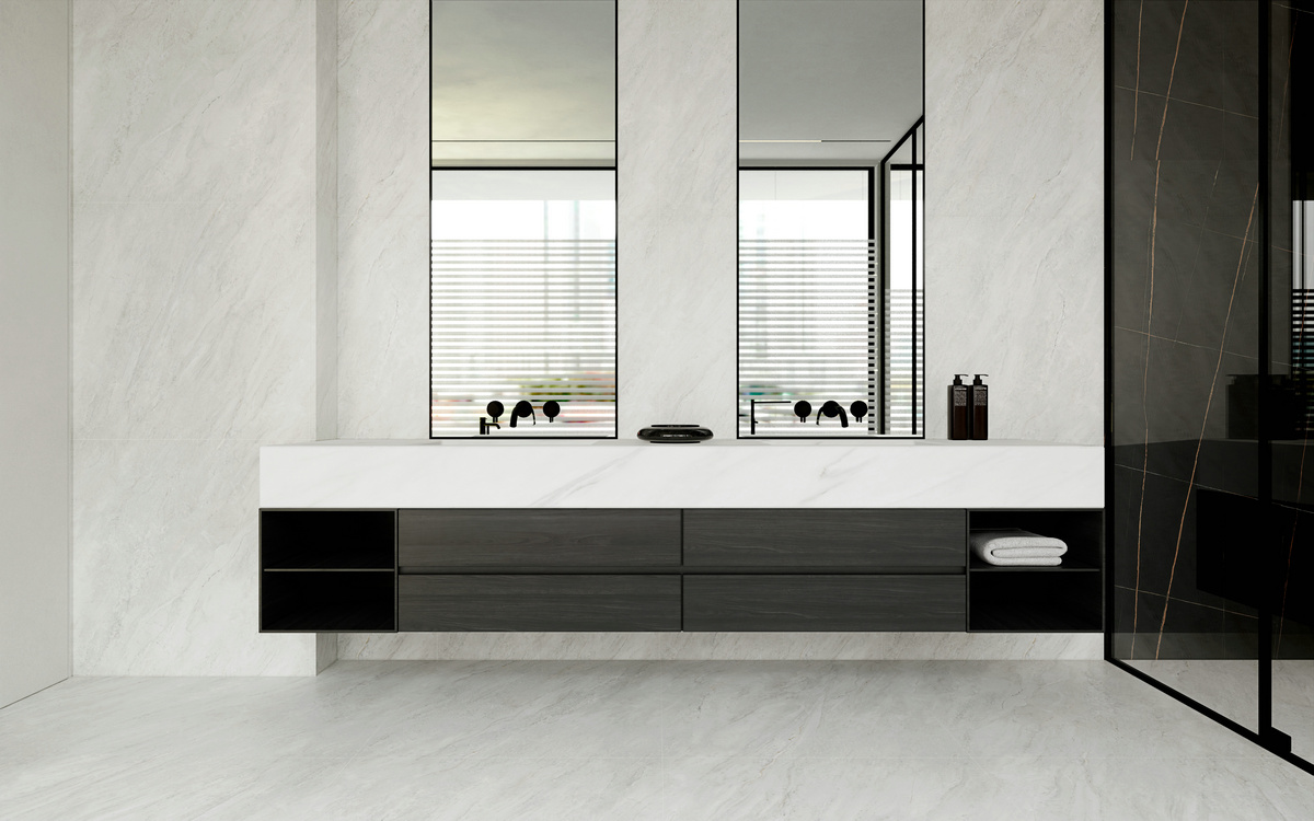 砖面流淌着素雅的细裂流水纹理,纹理细腻精致,充分展示珍稀原石质感,整体铺贴流畅自然,尽显高端气质,充满内敛的高级感,色系百搭耐看。